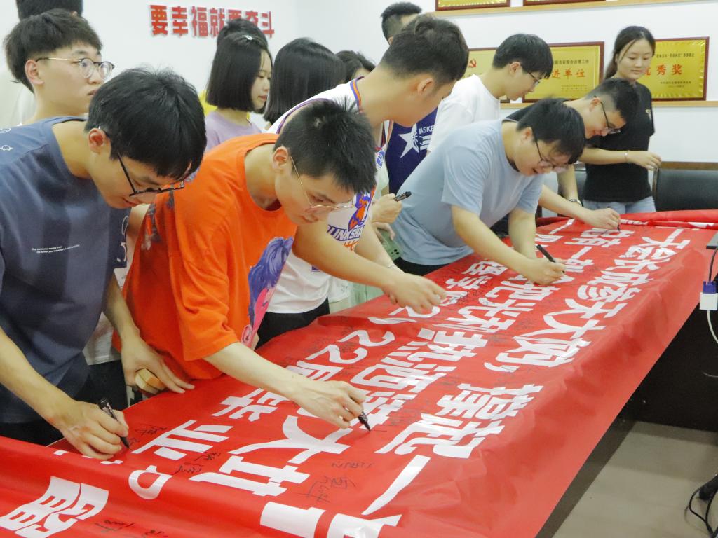 活动开始,学生会相关负责人员准备好毕业寄语横幅(习近平总书记在庆祝中国共青团成立100周年大会上的重要讲话内容),寓意毕业生茁壮成长、不断积聚能量、继续在新的起点上发光发热;毕业生们踊跃参加,纷纷在横幅上写下自己的签名,清晰的字体镌印在横幅上面,展现了毕业生对未来的向往充满更加坚定的信念。签字明志结束后,由团学相关负责人员向毕业生发放学院定制的毕业生纪念品,活动最后,毕业生集体合照留恋。