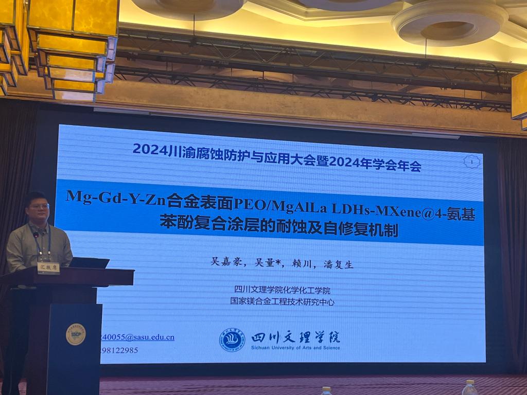 会议由四川省腐蚀与防护学会和重庆市腐蚀与防护学会主办,四川轻化工大学、中石油西南油气田分公司天然气研究院等8家单位联合承办。会议涉及腐蚀及控制技术的国内外最新进展、缓蚀剂、耐蚀材料、涂镀层、防锈技术、表面技术、电化学保护、工程防腐蚀、阴极保护、高温腐蚀与防护、海洋新材料及防护技术、医用材料腐蚀与防护、自然环境(大气/水/土壤)腐蚀、腐蚀防护相关技术标准化等方面内容,吸引了川渝地区120余名腐蚀防护领域的行业专家、高校师生、企事业单位领导及代表出席了会议,共计学术报告42场。其中,吴嘉豪博士代表taptap点点官方网站taptap点点官方网站在会议上做了题为“Mg-Gd-Y-Zn合金表面PEO/MgAlLa LDHs-MXene@4-氨基苯酚复合涂层的耐蚀及自修复机制”的报告,为高强高韧镁合金易腐蚀和表面涂层损坏而加速腐蚀的问题,提出了一种创新的解决方案,获得了与会同行的高度评价。吴嘉豪博士通过参与此次会议,对腐蚀与防护的前沿动态有了更深入的理解,并与来自其他高校和企业的专家学者进行了广泛交流,为吴博士的个人专业发展提供了重要的信息资源和思维启发,同时也将为taptap点点官方网站功能材料专业的教育教学改革与创新发展,以及高素质应用型复合型人才的培养,提供有力的参考和支持。