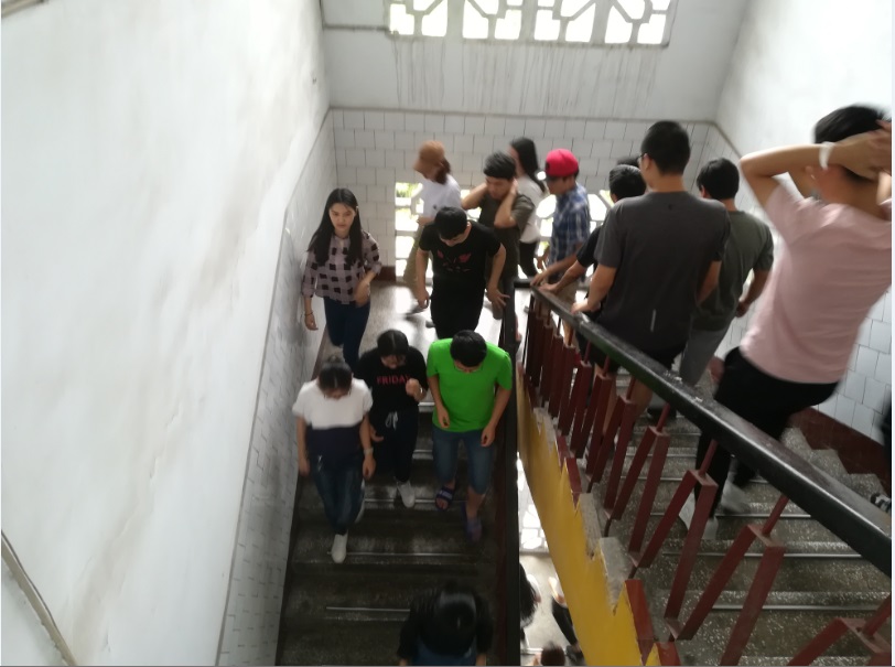 本次演练模拟了上课期间突然发生地震,正在上课的老师和同学们紧急撤离的过程。12:40,“地震”来临,警报拉响。在一教楼1至5楼的“上课”的同学们迅速做出反应,大家双手抱头,快速而有序的撤出教学楼,在升旗台前空地集结。整个撤离过程约2分钟17秒。