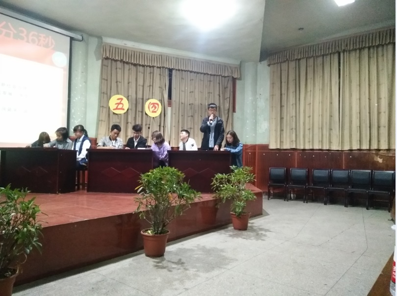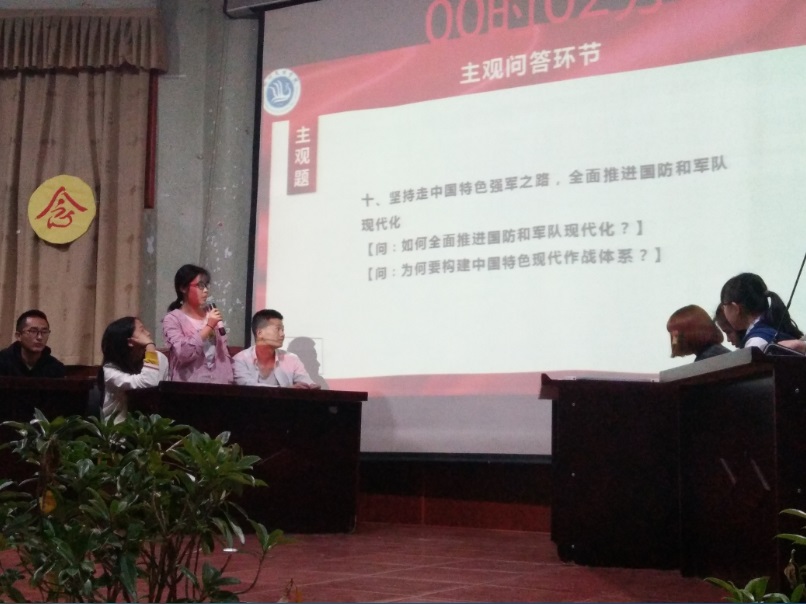 经过初赛的选拔,来自化工学院2017级的五支代表队进入了决赛。比赛分为必答、选答和主观问答三个环节,围绕着十九大报告、习近平新时代中国特色社会主义思想、五四运动等内容展开。必答题中选择题和判断题由五个组轮流作答,而选答题和主观问答题根据当前总分高低来排列作答顺序,依次选择关于军事、环境、民生等七个方面的题型。主观问答,则由评委根据选手表现进行打分。比赛中,参赛选手沉着应对、密切配合,分秒必争,以饱满的精神状态,积极踊跃的回答每一道题,展现出了昂扬的斗志。比赛在主观问题环节达到了高潮。面对开放式的问题,在短的时间内,选手们周密思考,充分讨论,结合党的理论知识和对国家、社会、生活的感悟,认真作答,赢得了观众阵阵掌声。最终,经过紧张激烈的角逐,来自2017级4班的第四组代表队以206的高分获得了本次知识竞赛的第一名。