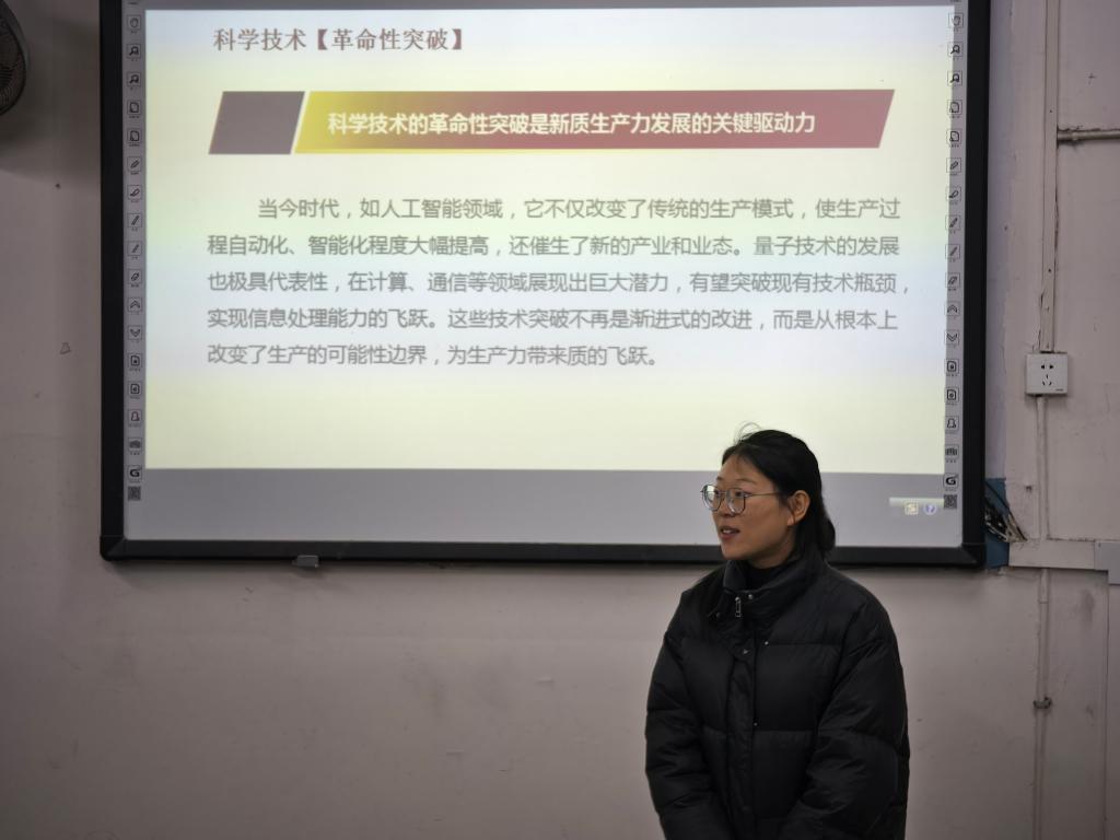 宣讲伊始,主讲人郑晓婷带领大家观看相关影片,并围绕“何为新质生产力”、“新质生产力对我们的具体影响”以及“在新质生产力影响之下青年应当如何作为”这三个问题展开深入探讨,以此剖析影片。随后,她从新质生产力的时代背景出发,指出在我国全面建设社会主义现代化国家的时代背景下,新质生产力已呈现出新的内涵与特征。积极发展新质生产力,已成为我国在新发展阶段构建国家竞争新优势的战略抉择。