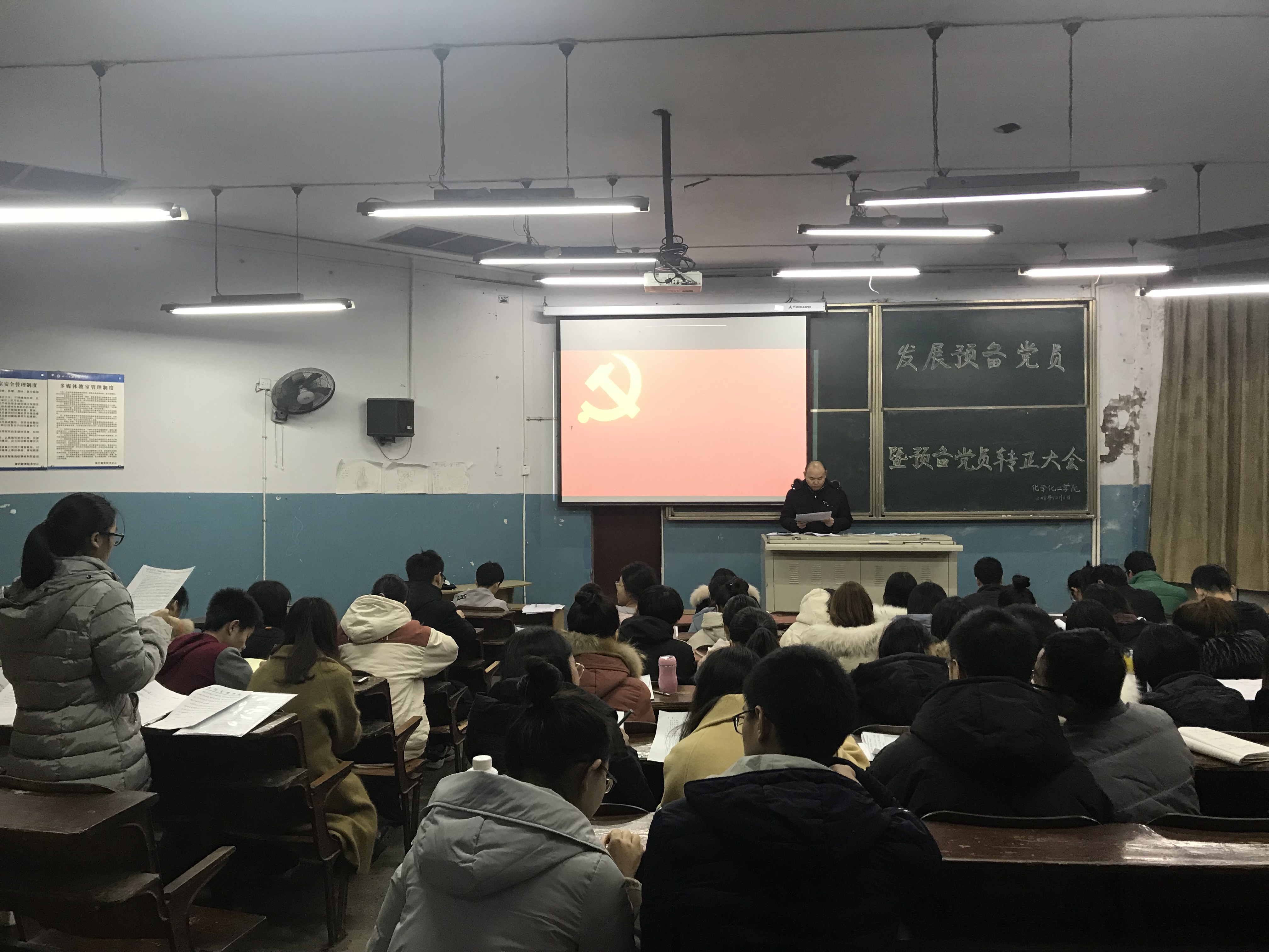 最后,全体人员重温了入党誓词。屈川副书记对本次大会进行了总结发言,对转正的党员同志和新发展的预备党员同志表示了衷心的祝贺并给予了殷切希望,屈川老师表示希望同志们能够严于律己,严格规范和约束自己,认识到入党的严肃性,在广大群众中充分体现党员的先进性,真正起到模范带头作用。相信新党员一定会成为党的新生力量,为党和人民做出自己应有的贡献。