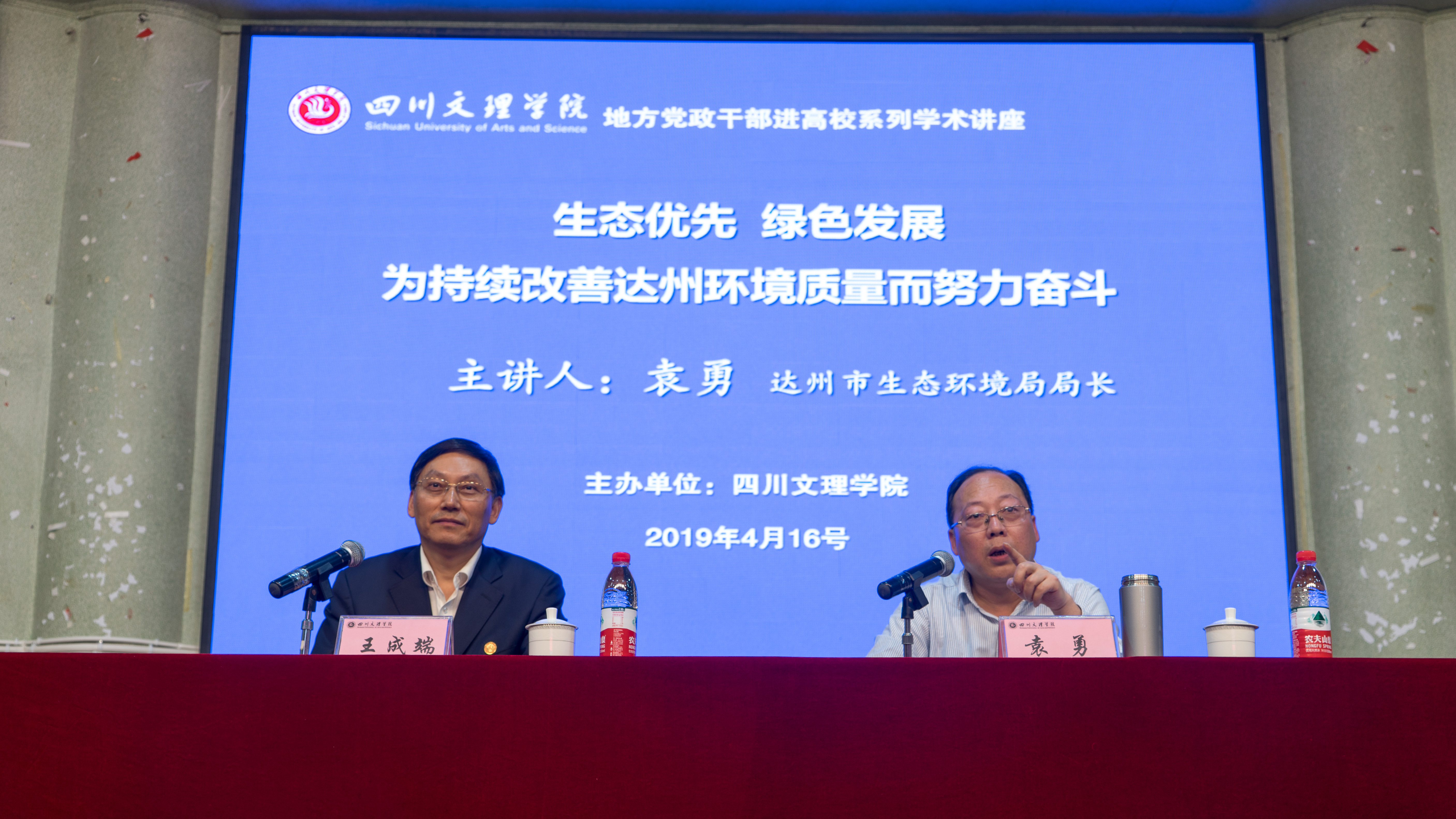 为认真学习贯彻习近平生态文明思想,深刻把握新时代推进生态文明建设的基本原则、生态文明体系的丰富内涵、绿水青山就是金山银山的重要发展理念,切实增强大学生生态环境保护工作的责任感、使命感, 2019年4月16日下午,达州市生态环境局局长袁勇在taptap点点官方网站南坝校区学术报告厅作题为“生态优先,绿色发展——为持续改善达州生态环境质量而努力奋斗”的专题学术讲座,讲座由taptap点点官方网站党委书记王成端教授主持。taptap点点官方网站、智能制造学院师生聆听了讲座。